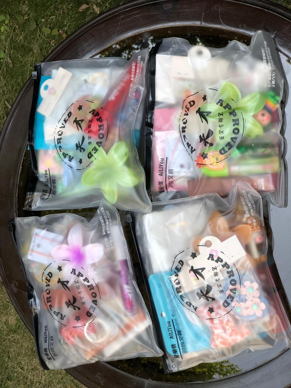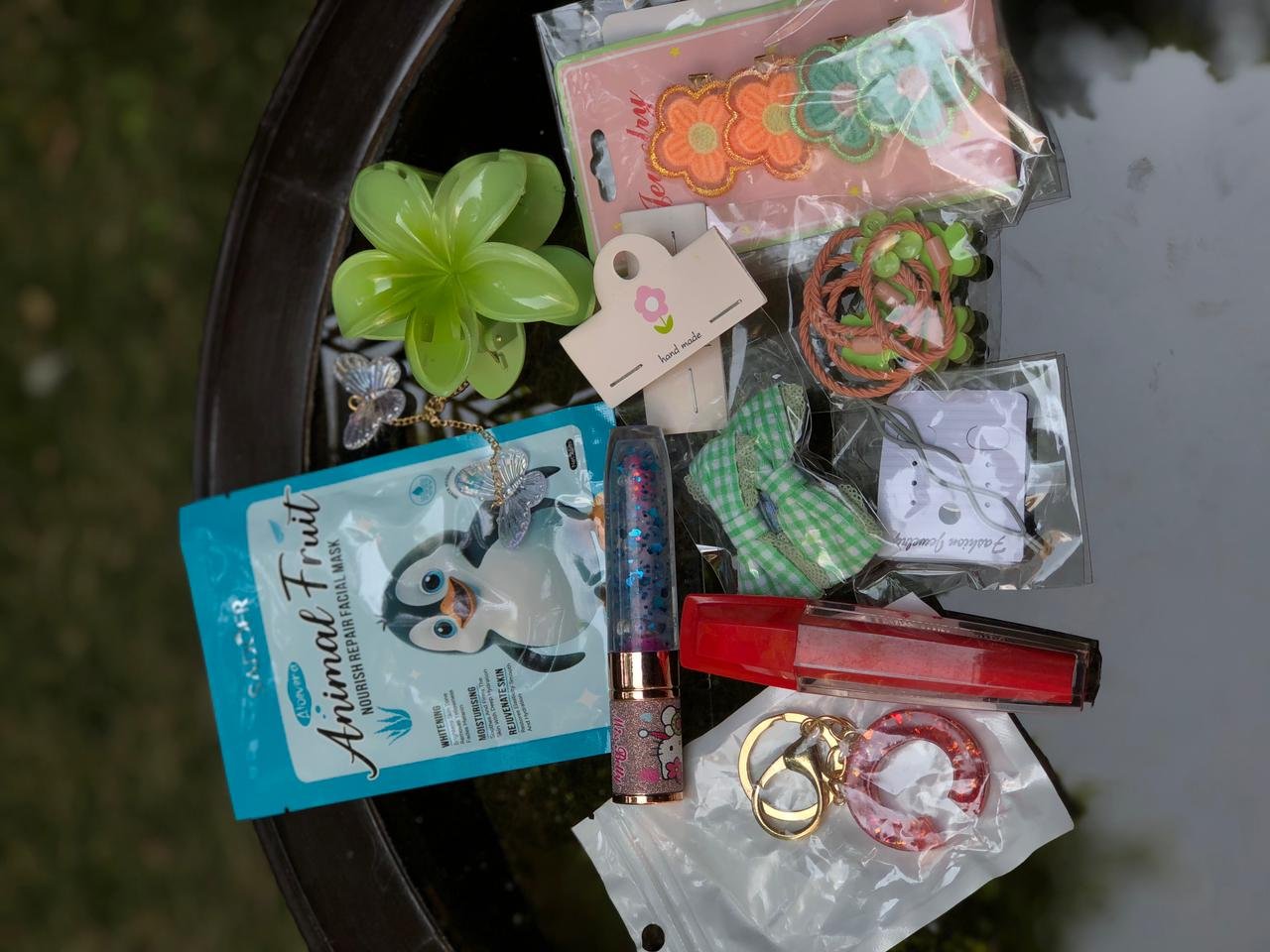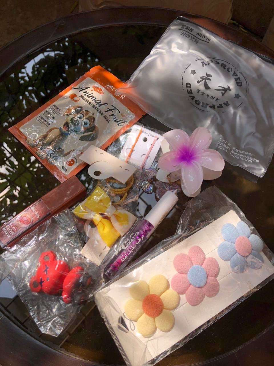 • The items include an “Animal Fruit” facial mask, a lip gloss/lip balm, and various hair accessories.